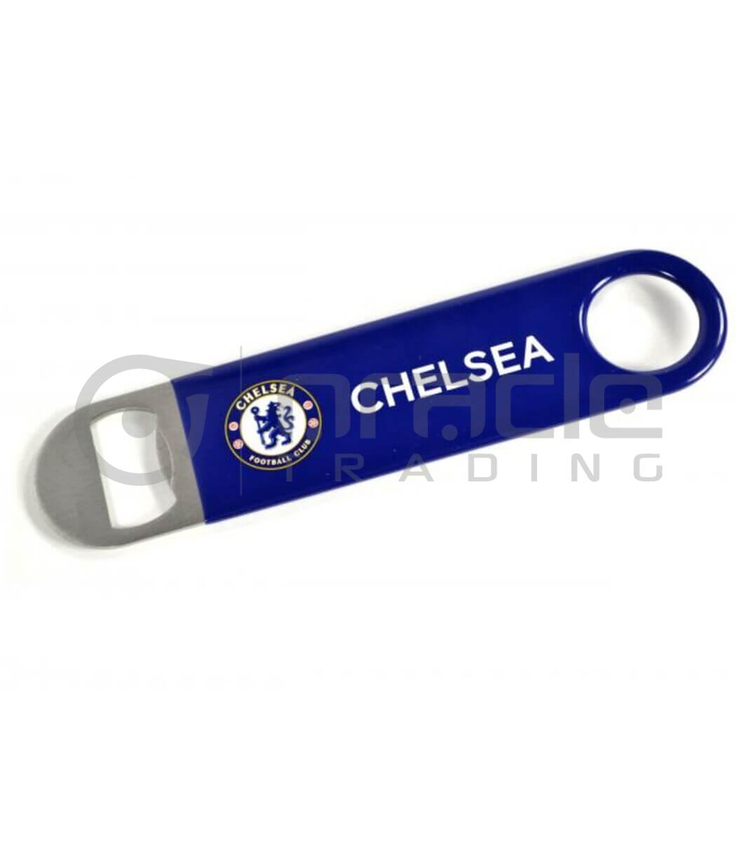The Chelsea Bottle Opener Magnet is a practical addition for any Chelsea fan. Made from stainless steel and measuring 7 inches by 1.5 inches, it combines functionality with team spirit. This officially licensed product comes with a retail header card that suits store display needs. Designed as part of the Chelsea magnets range, it offers both utility and a sleek look on any magnetic surface.