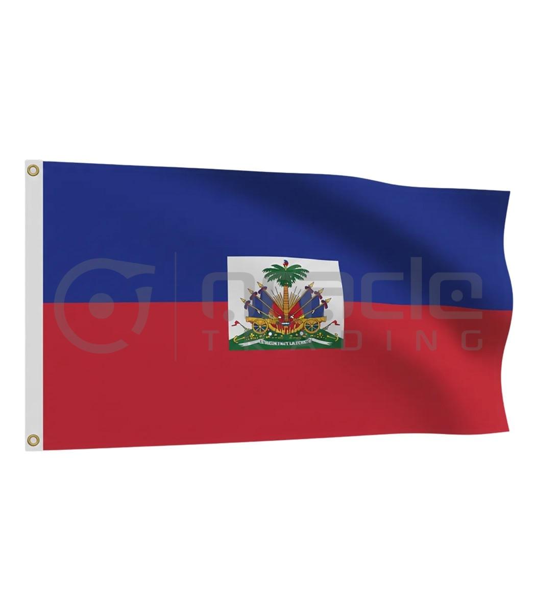 The Large 3’x5′ Haiti Flag showcases the vibrant blue and red bands with the detailed Haitian coat of arms at the centre. Crafted from 100% premium polyester, this flag features reinforced stitching and two secure grommets for lasting display. Each one is individually packaged for protection. A great choice for national celebrations, international sports events, or brightening up your home decor.